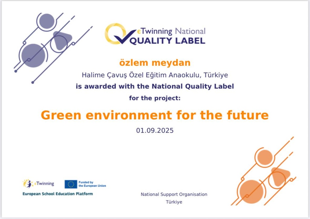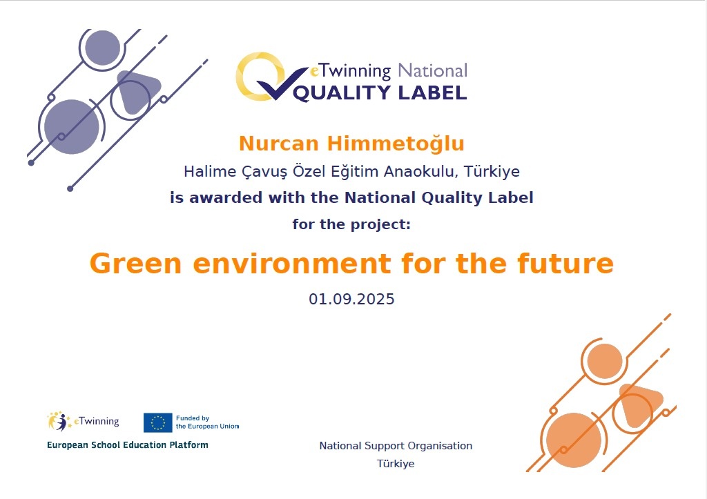 Okulumuz Müdür Yardımcısı Nurcan HİMMETOĞLU ve Okul Öncesi Öğretmenlerimizden Ş. Özlem MEYDAN'ın dahil olduğu "Green Environment For The Future" "Gelecek İçin Yeşil Çevre" isimli projelerden Ulusal Kalite Etiketlerini almıştır.